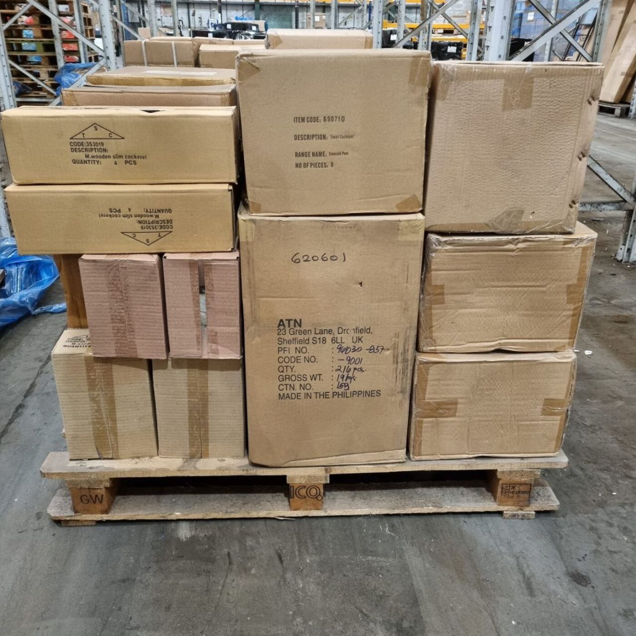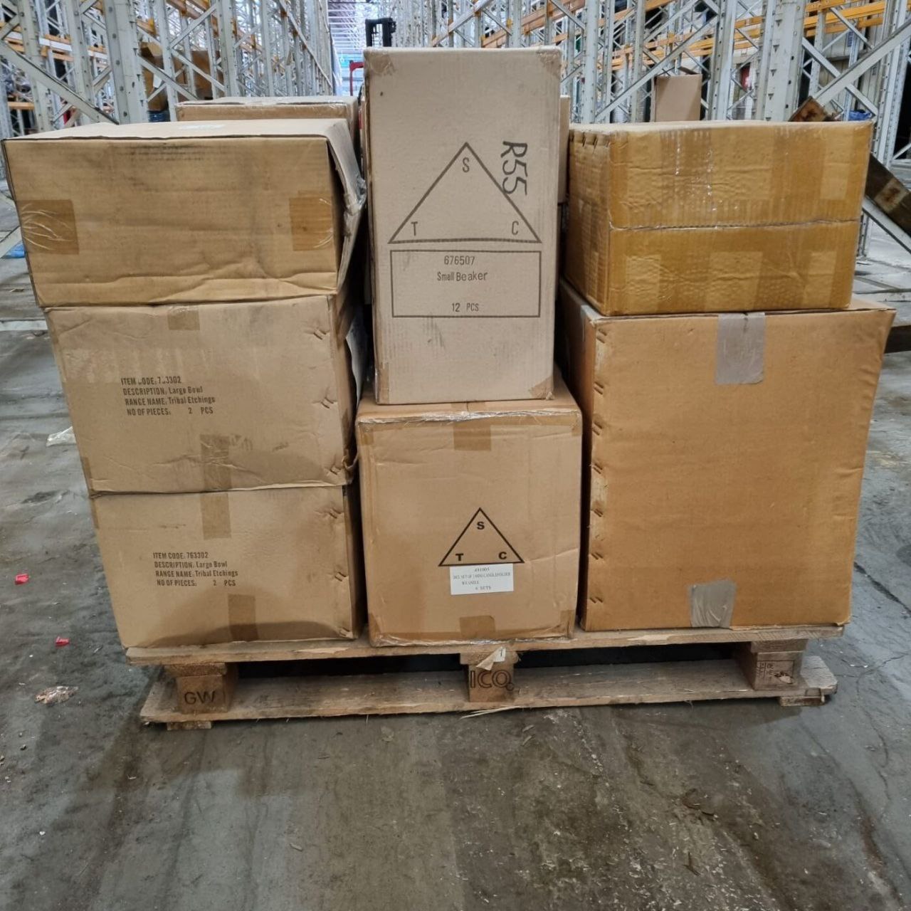 Each pallet is packed with a variety of items, including: